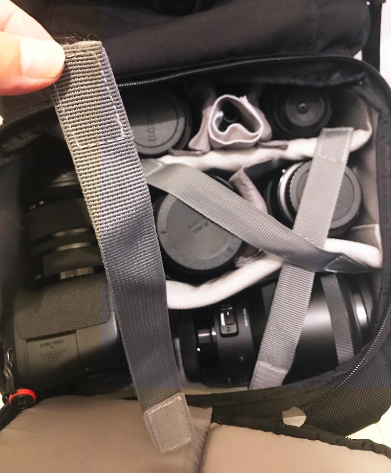 カメラとレンズを入れてみました。下の部屋だけでも結構沢山入ります。簡単に入れただけですが一眼レフ本体、レンズ5本、他小物が入っています。