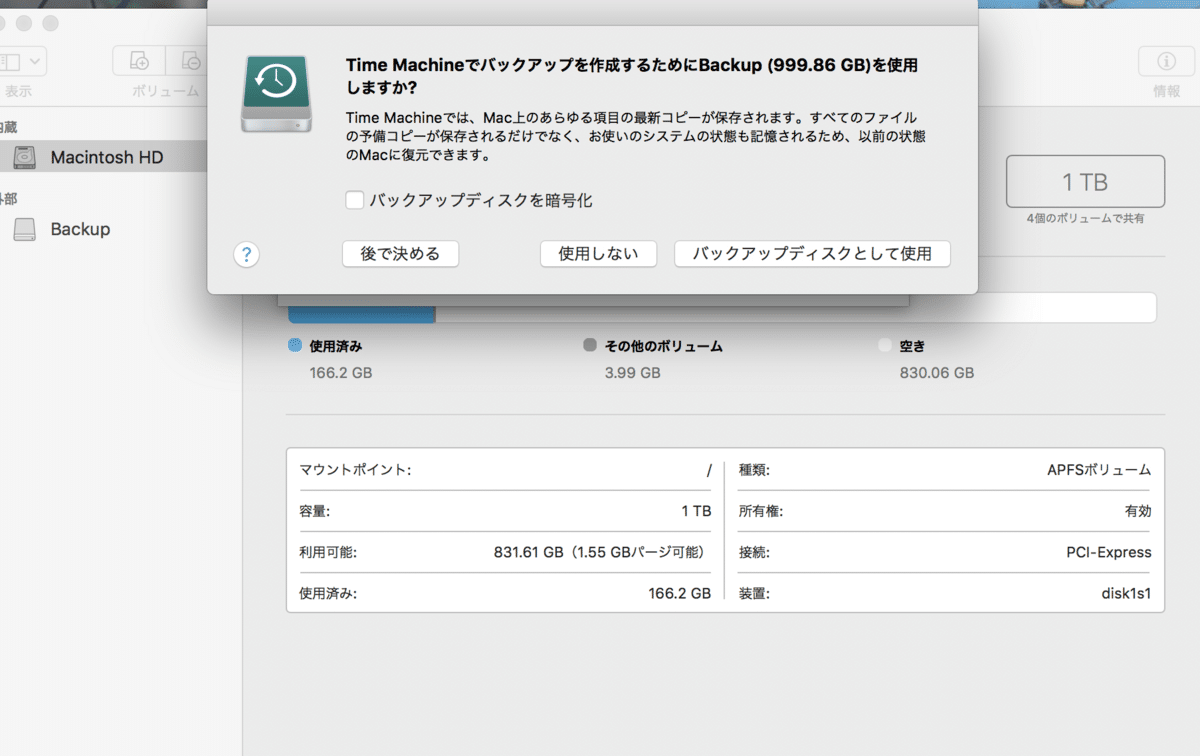 「バックアップディスクとして使用」を選ぶとそのまま設定画面に移行します。